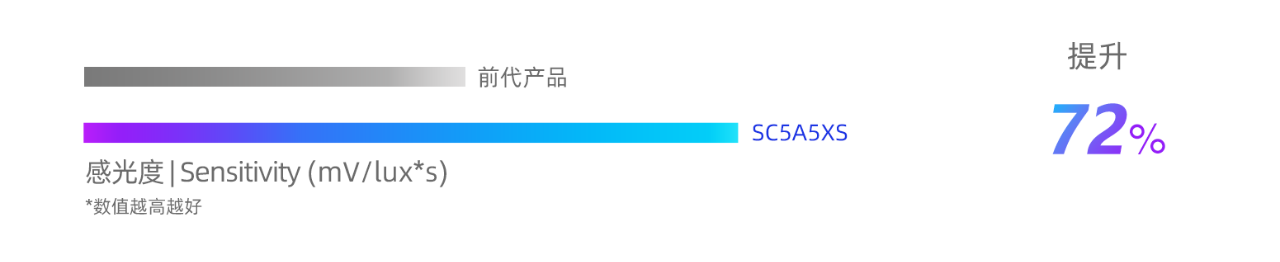 SC5A5XS采用了当前业内手机应用CMOS图像传感器的最大光学尺寸1英寸超大底,具备1.6μm的超大像素尺寸,拥有超高感光性能,其感光度高达2569mV/lux*s,较前代产品提升约72%。SC5A5XS的超高感度能够为旗舰手机摄像头带来无惧昼夜的超感光影像能力,让暗夜时分亦精彩出片。