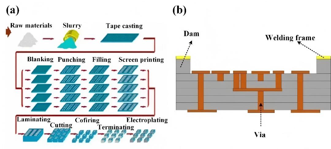 (a)HTCC陶瓷基板制备工艺流程和 (b)结构示意图