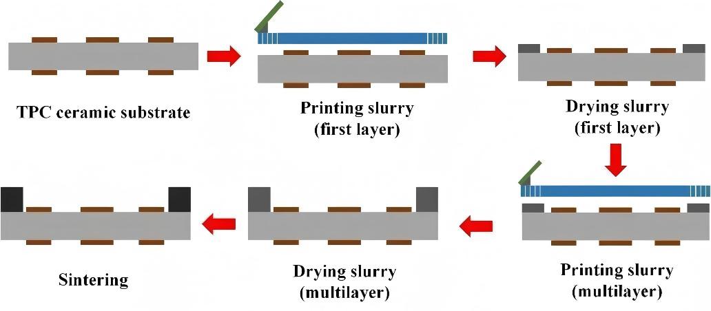 在平面TPC基板上通过多次丝网印刷陶瓷浆料并烧结,形成腔体结构。其优点是工艺简单、热膨胀匹配性好,但受丝网印刷限制,腔体厚度和线路精度有限,适用于对精度要求不高的小型器件封装。